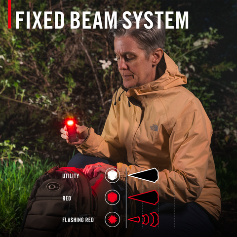 The right light for the moment. The Dual-Color White & Red Beam combines an all-white Utility Beam for general use with a red, anti-glare beam that prevents “night blinding” while also offering a tool for emergency signaling.