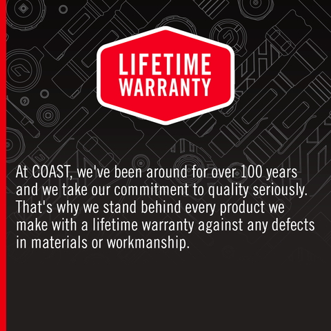 COAST warranties its COAST knives, tools, COAST LED Flashlights/Headlamps and ZITHION-X AA/AAA Batteries to be free of defects in materials and workmanship for the life of the original purchaser. This warranty does not cover normal wear and tear, nor damage resulting from misuse or neglect. Warranty does not cover batteries and charging accessories (or damage caused by either). Non-ZXAA or ZXAAA Batteries or damage caused by batteries (i.e. leakage) is not included in the guarantee.