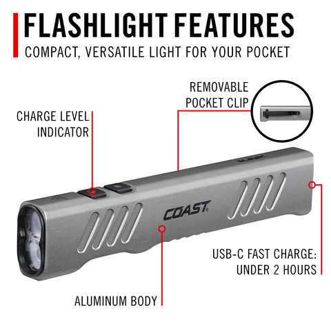 With a built-in USB-C port, your battery can be charged using a USB-C cord. Some COAST models can be charged both inside or outside the light.